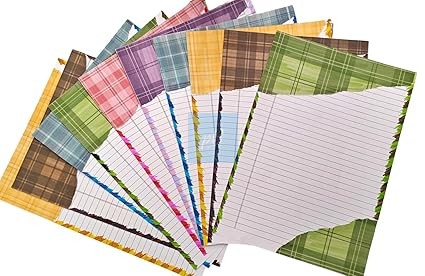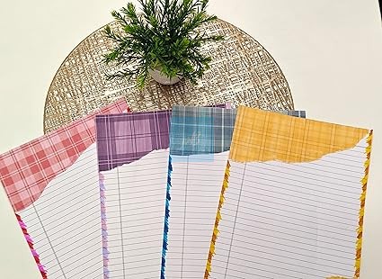 Handmade Designer Sheet Pack (Set of 10). Each A4-sized sheet is carefully crafted with colourful plaid patterns and lined spaces for neat writing and decoration. Perfect for school projects, journaling, scrapbooking, gift wrapping, and handmade cards, these premium quality sheets give your work a professional and artistic look. The unique combination of colours and textures makes every piece stand out beautifully.