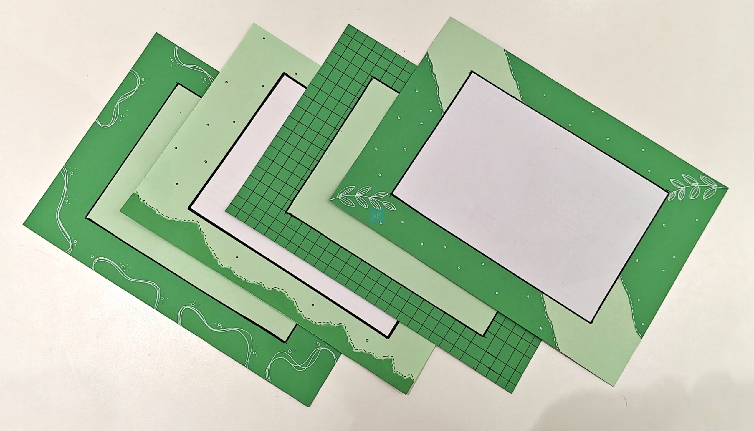 Give your school and college projects a professional, eye-catching appeal with this Handmade A4 Designer Project Sheet Set – Green Theme (Pack of 10). Each sheet features unique, aesthetic layouts crafted with coordinated shades of green, doodles, borders, and artistic patterns—perfect for students who want their assignments, journals, or scrapbooks to stand out.