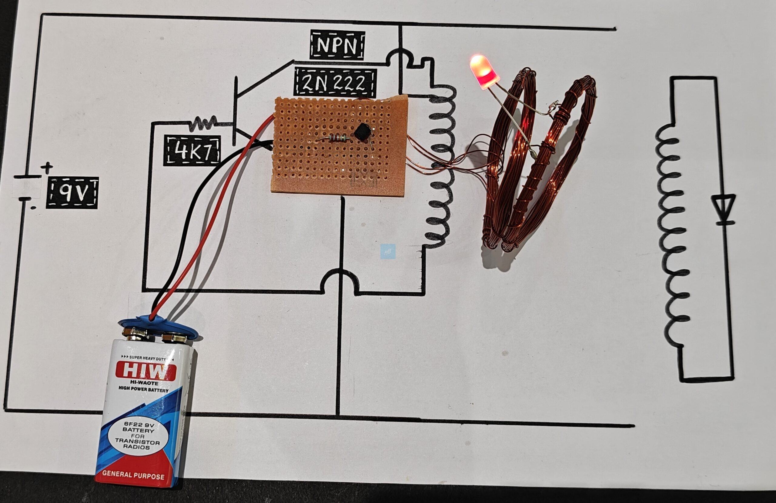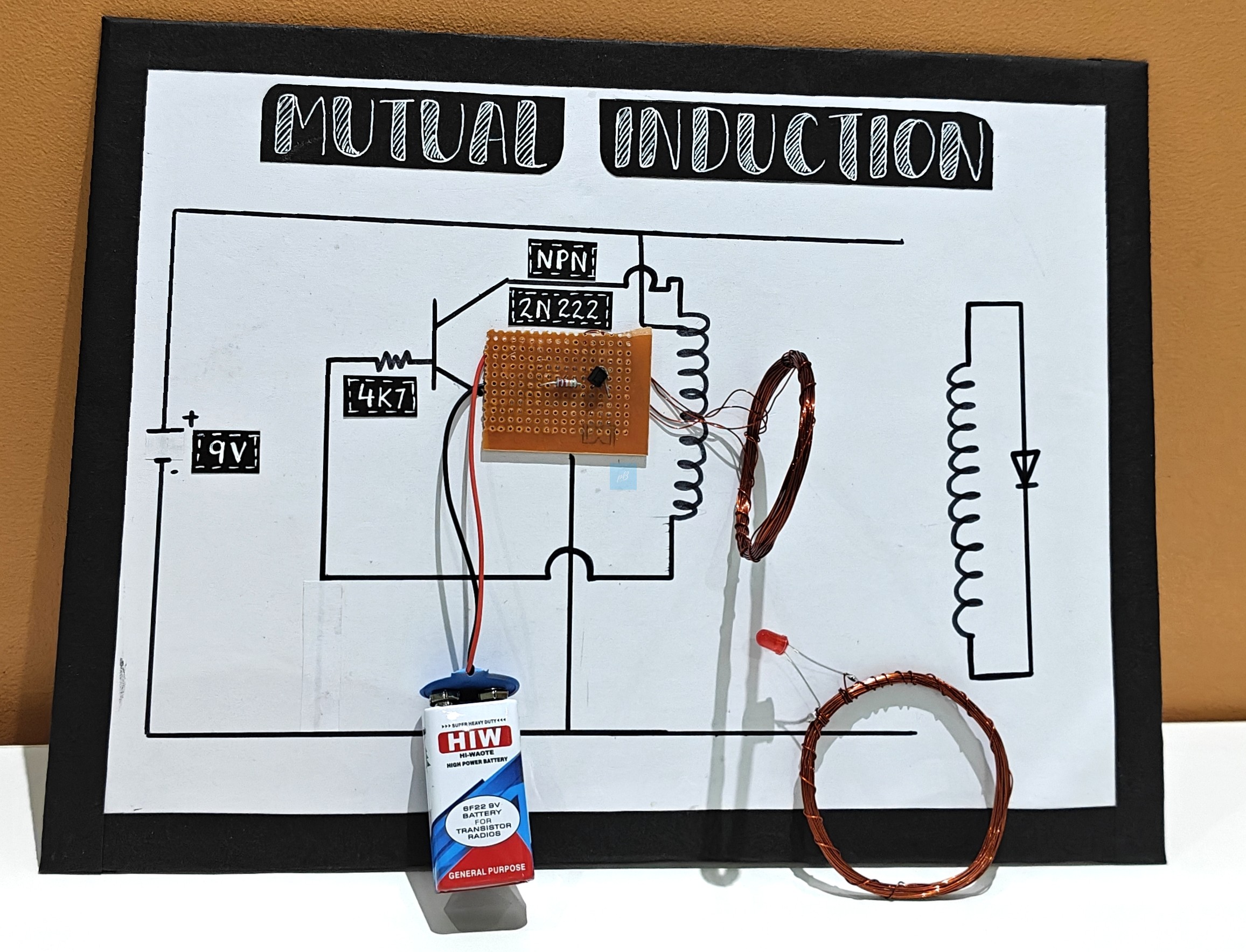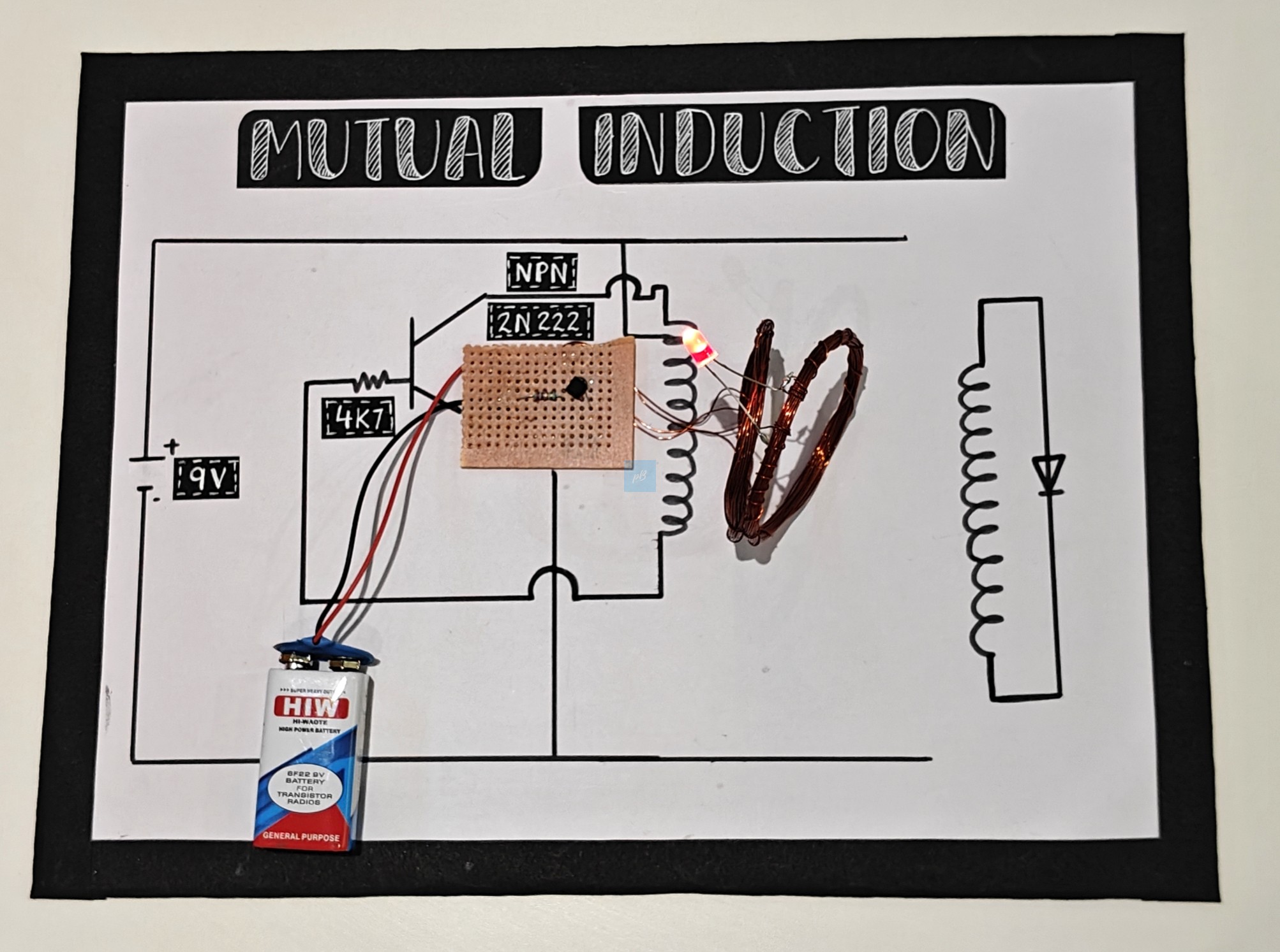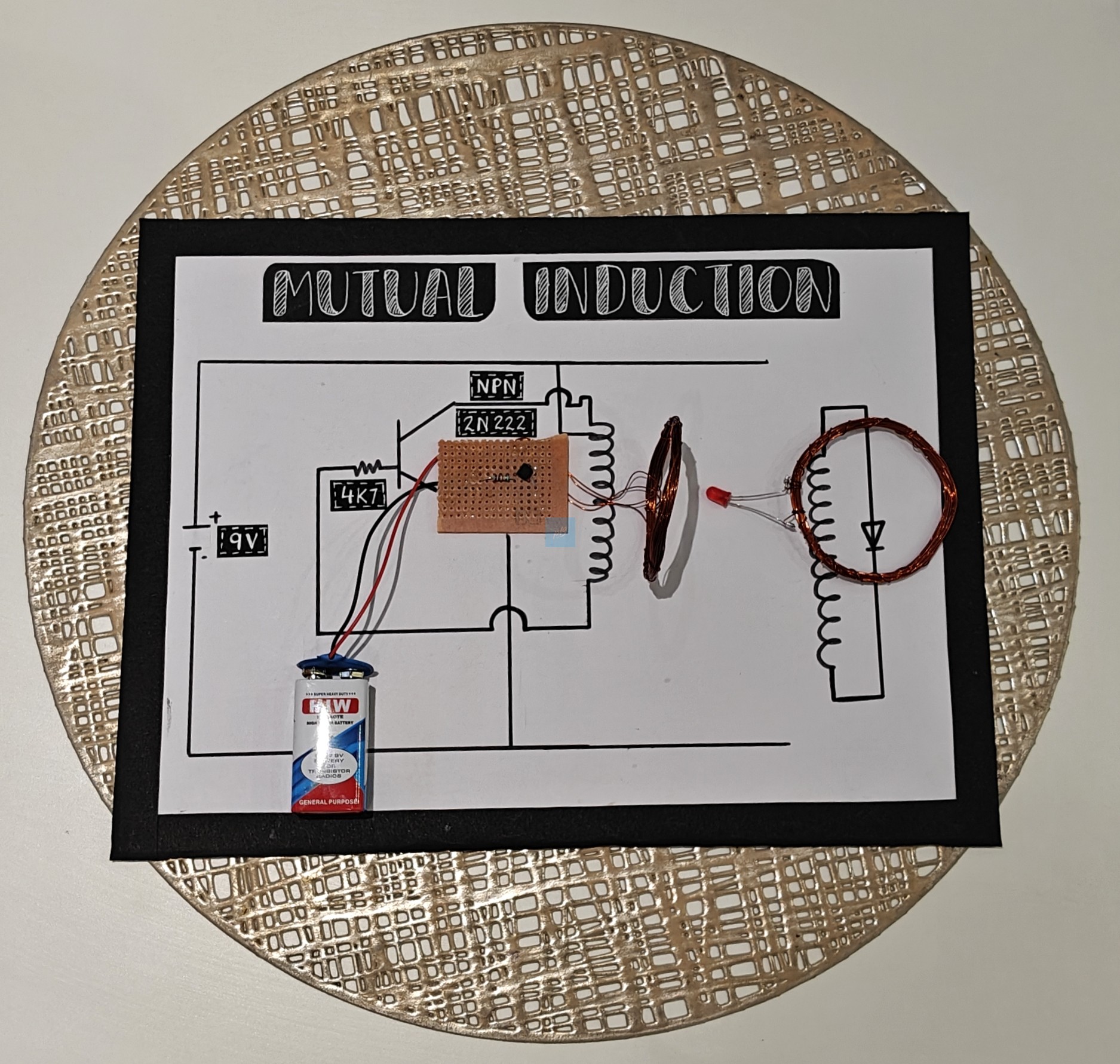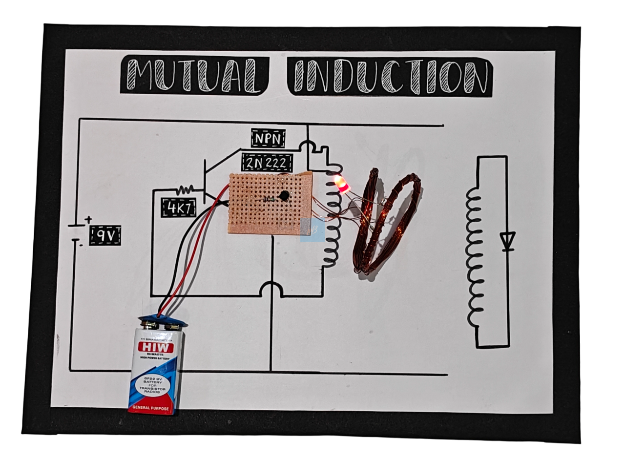 It includes essential electronic components such as a 2N2222 NPN transistor, a resistor, a breadboard, copper-wire induction coils, an LED indicator, connecting wires, and a 9V battery. Once assembled, the circuit generates an alternating magnetic field in the primary coil, causing the secondary coil to produce enough induced voltage to illuminate the LED. This provides a clear visual demonstration of mutual induction and transformer-like action. Ideal for STEM education, science fair projects, classroom demonstrations, electronics learning, and physics experiments.